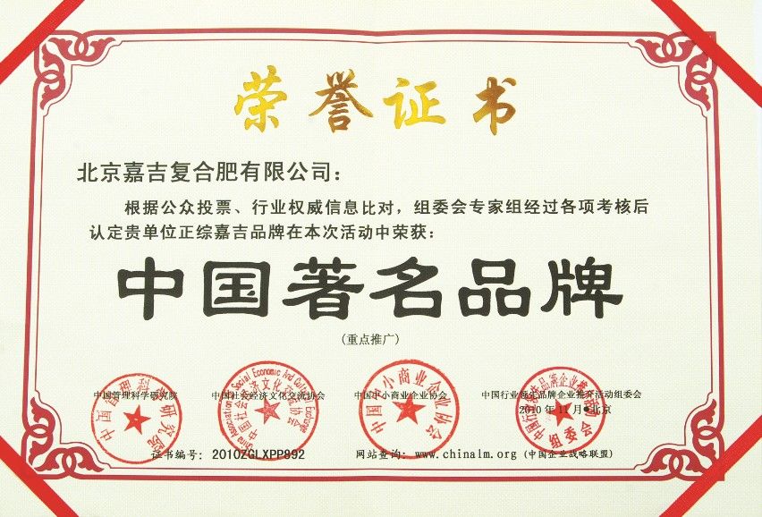 北京美嘉吉复合肥有限公司荣誉证书